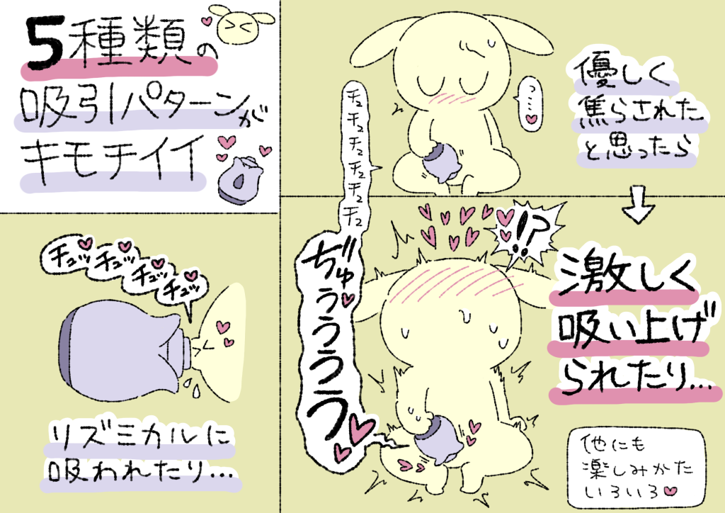吸引パターンも5種類あるから、リズミカルに吸われたり、優しく焦らされたと思ったら激しく吸い上げられたり、バリエーション豊かな刺激を楽しめるぞ!